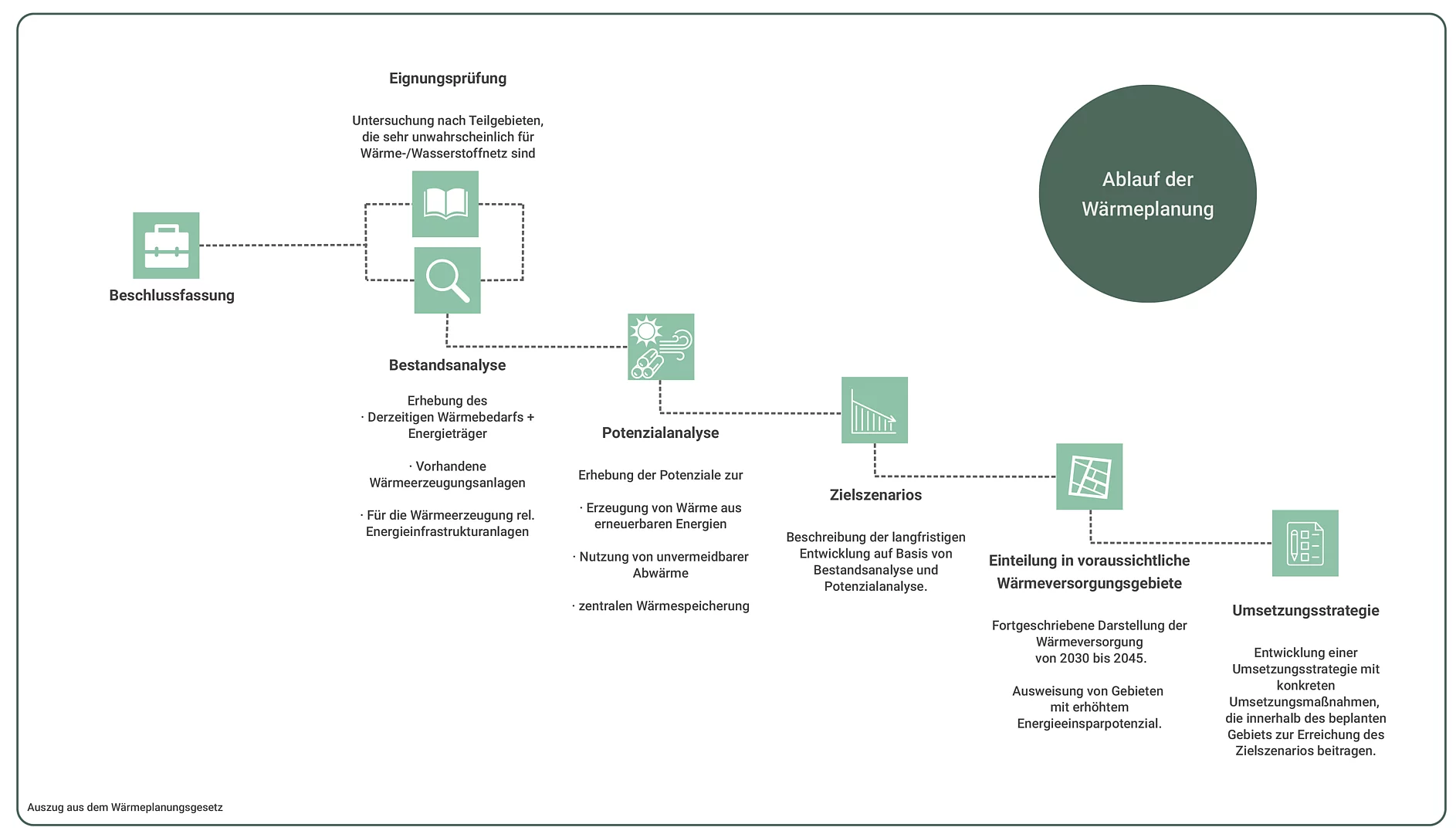 Im ersten Schritt wird eine Eignungsprüfung für die Teilgebiete der Stadt durchgeführt, um die grundlegenden Rahmenbedingungen zu ermitteln. Parallel dazu erfolgt die Datenerhebung für die Bestands- und Potenzialanalyse. Basierend darauf wird die Stadt in voraussichtliche Wärmeversorgungsgebiete eingeteilt und es werden Zielszenarien erarbeitet. Im letzten Schritt wird eine Umsetzungsstrategie entwickelt.