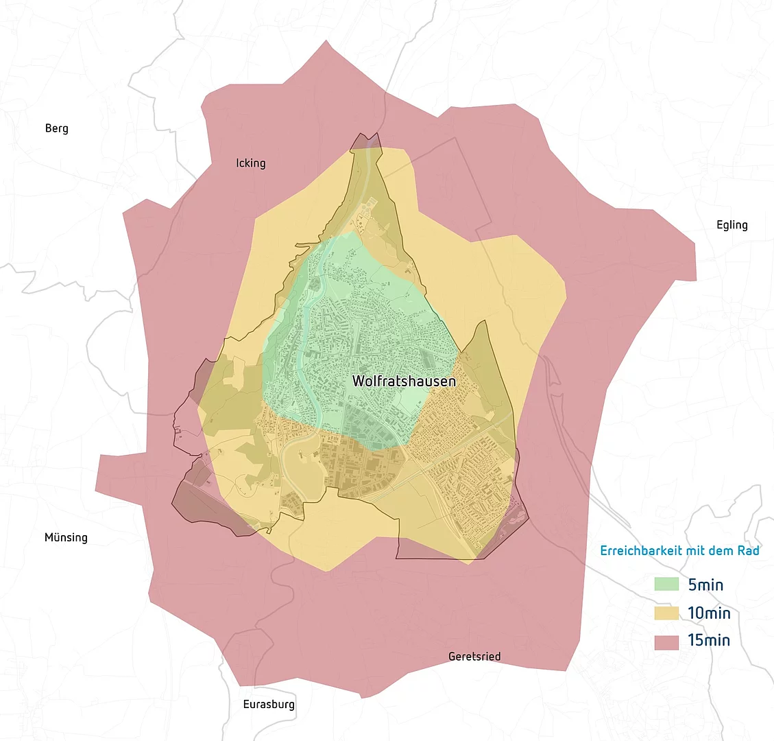 Die Stadt Wolfratshausen zeichnet sich durch kurze Wege aus. Innerhalb von 15 Minuten lassen sich sämtliche Ziele im Stadtgebiet mit dem Fahrrad erreichen. Die nebenstehende Grafik veranschaulicht das Potenzial des Radverkehrs als umweltfreundliche und effiziente Mobilitätsform im Alltag in Wolfratshausen.
