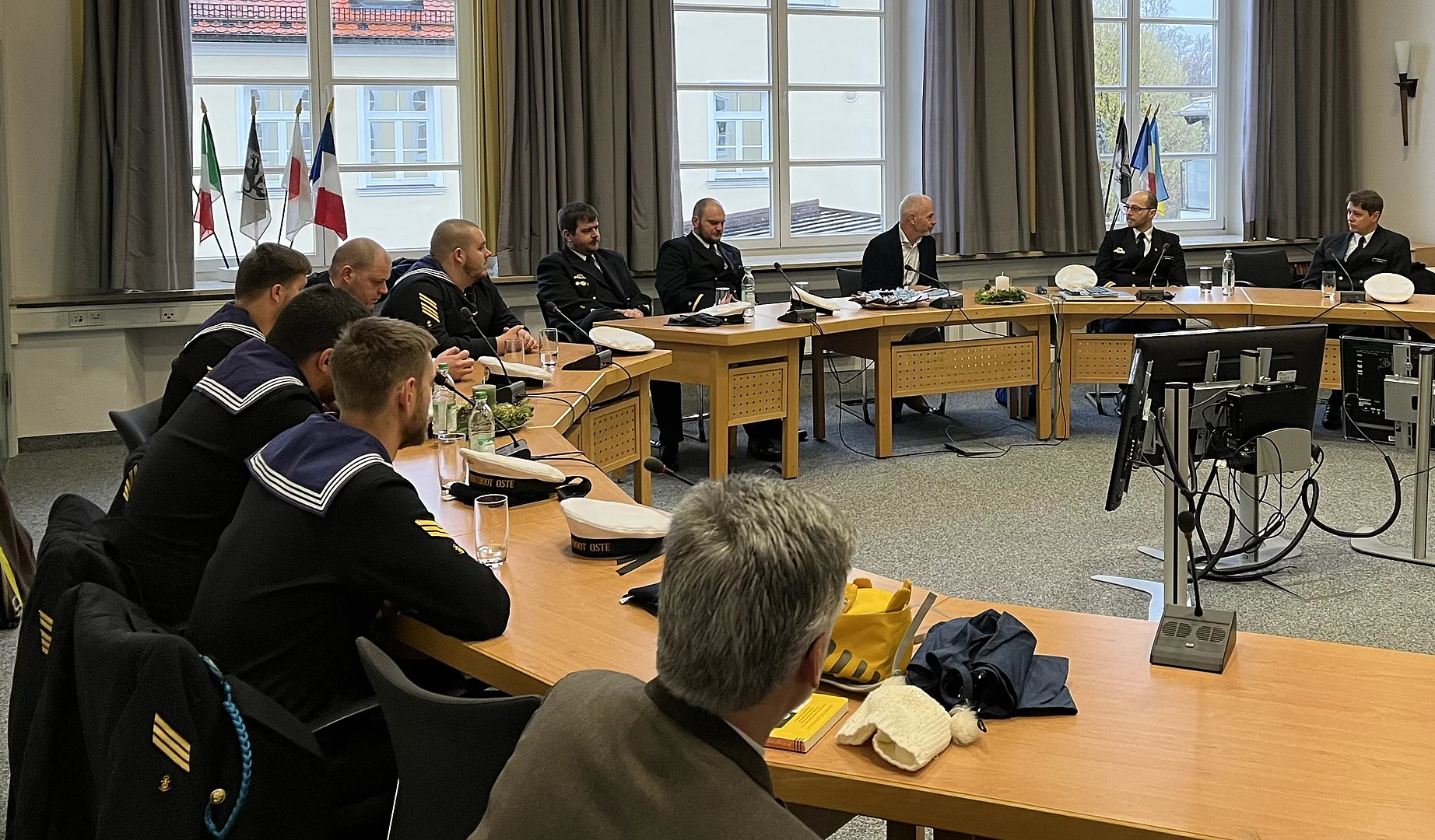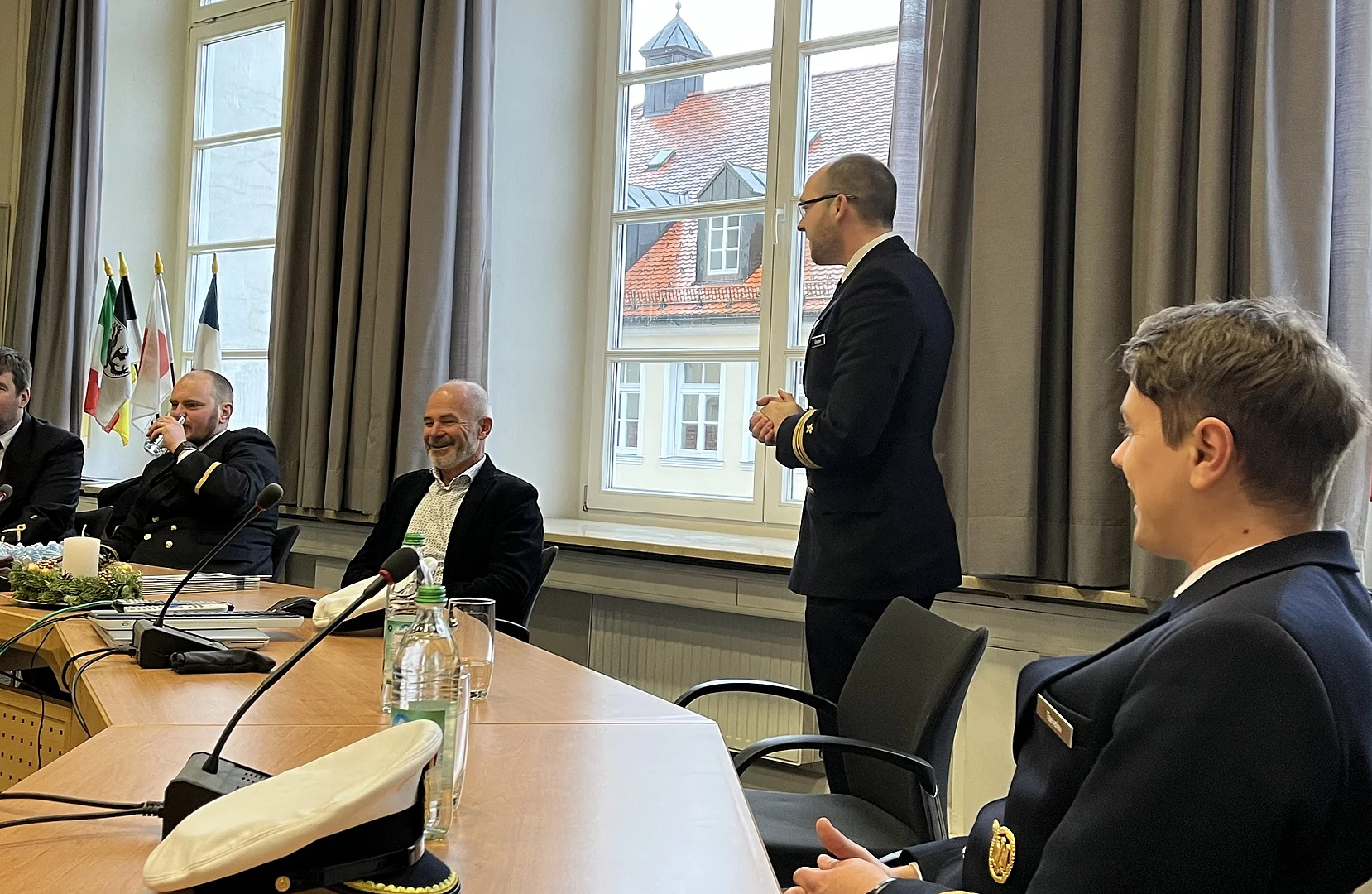 Am Samstag begrüßte der Erste Bürgermeister Klaus Heilinglechner eine Delegation des Patenschiffs OSTE aus Eckernförde im Rathaus. Elf Besatzungsmitglieder hatten die weite Reise von der See ins Oberland unternommen, um unter anderem auf dem Christkindlmarkt gemeinsam mit den Gebirgsschützen Hochprozentiges zu verkaufen.