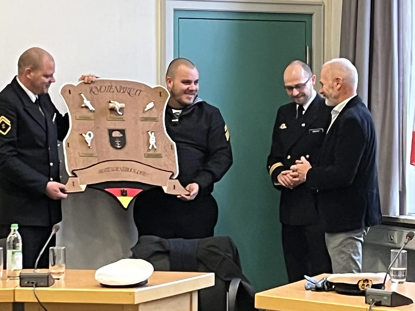 Die Besatzung bedankte sich herzlich für die Einladung und überreichte beim Empfang ein selbstgestaltetes Knotenbrett. Für einen Großteil der Marinesoldaten war es der erste Besuch in Wolfratshausen. Aufgenommen wurden die Besatzungsmitglieder von Wolfratshauser Gastfamilien - viele davon aus den Reihen der Gebirgsschützen. Die Gebirgsschützen stellten außerdem ihr Schützenheim als Anlaufstelle zur Verfügung und gestalteten überwiegend das Abendprogramm für die Mannschaft.