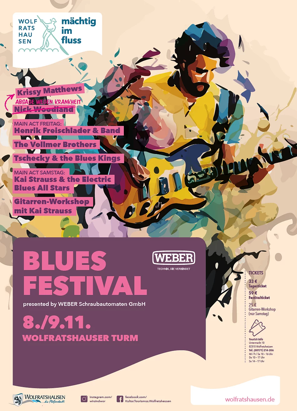 Hier kommt unser Rezept gegen den Herbstblues: Am 8. und 9. November 2024 lädt die Stadt Wolfratshausen ein zum 1. BLUES FESTIVAL, präsentiert von der WEBER Schraubautomaten GmbH, in den Wolfratshauser Turm. Freuen Sie sich auf zwei Tage mit coolen Grooves und erstklassigen Künstlern!