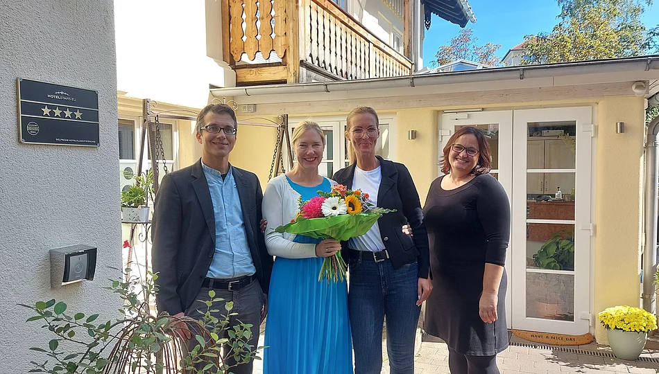 Das beliebte Boutique-Hotel „Landhaus Café, Hotel und Restaurant“ in Wolfratshausen ist seit Sommer 2023 ein 4-Sterne-Haus. Zu dieser Auszeichnung gratulieren Stadtmanager Dr. Stefan Werner (li.) und Tourismusleiterin Christine Garayhi (re.) der Inhaberin Alexandra Steiner (Mitte mit Blumenstrauß) und dem gesamten Team.