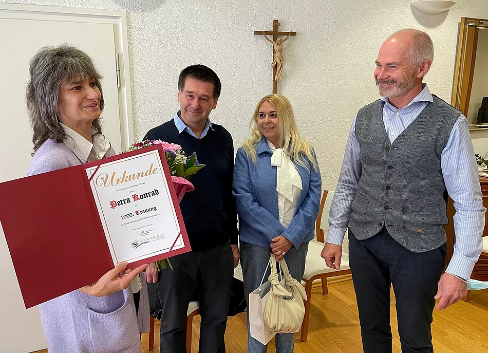 Anlässlich des Jubiläums gratulierte Erster Bürgermeister Klaus Heilinglechner der Standesbeamtin ganz herzlich und überreichte ihr eine Urkunde, Blumen und eine Flasche Sekt. Obwohl Heiraten mittlerweile Routine für die erfahrene Standesbeamtin ist – dieses Jubiläum ist bemerkenswert. „Das ist für mich die schönste Tätigkeit eines Standesbeamten. Ich traue wirklich sehr gerne“, sagt Petra Konrad und strahlt.