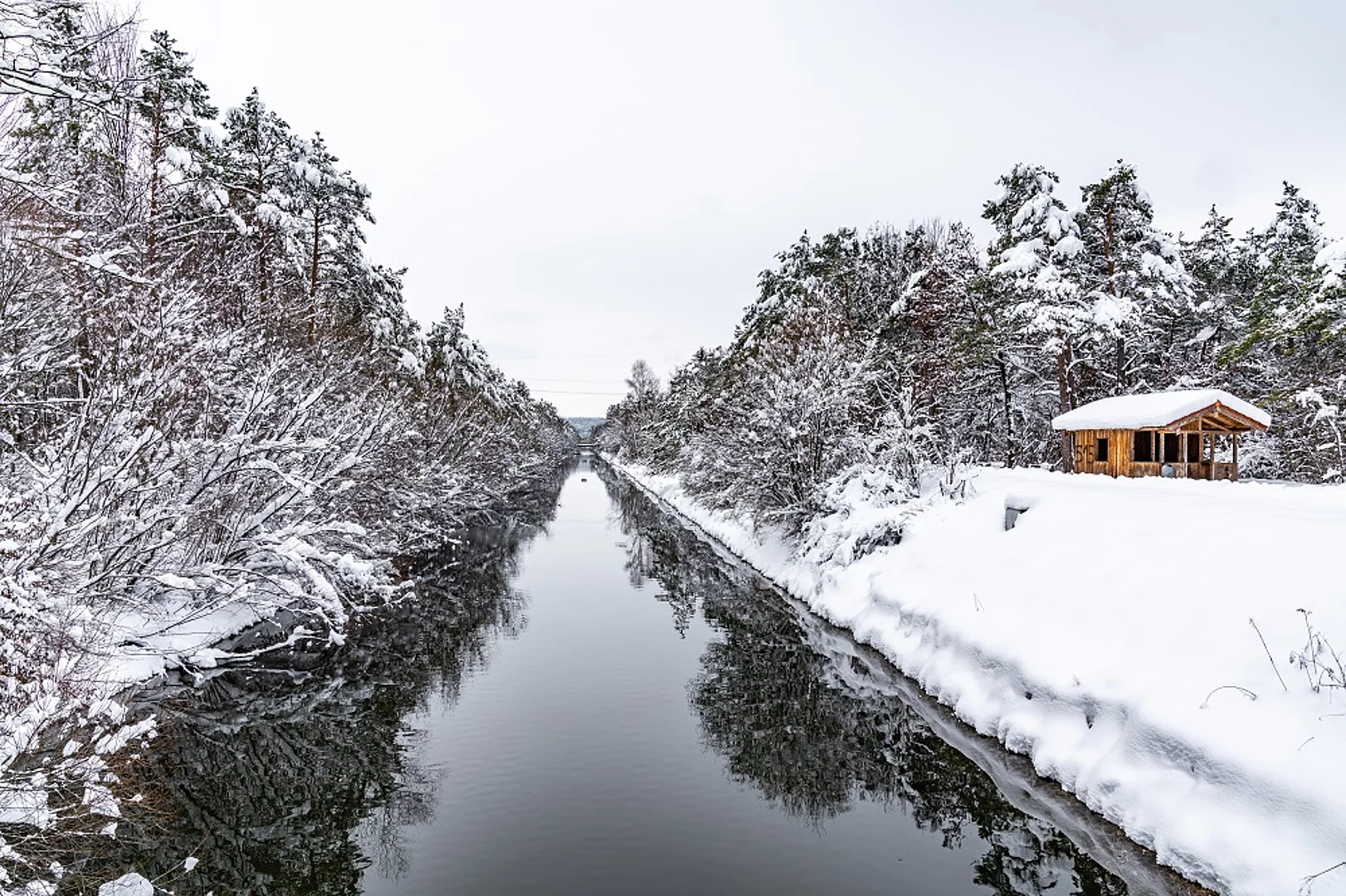 Die Wasseroberfläche im Loisach-Isar-Kanal ist bei entsprechenden Temperaturen in den Abschnitten mit stehenden Wasserflächen gefroren.
