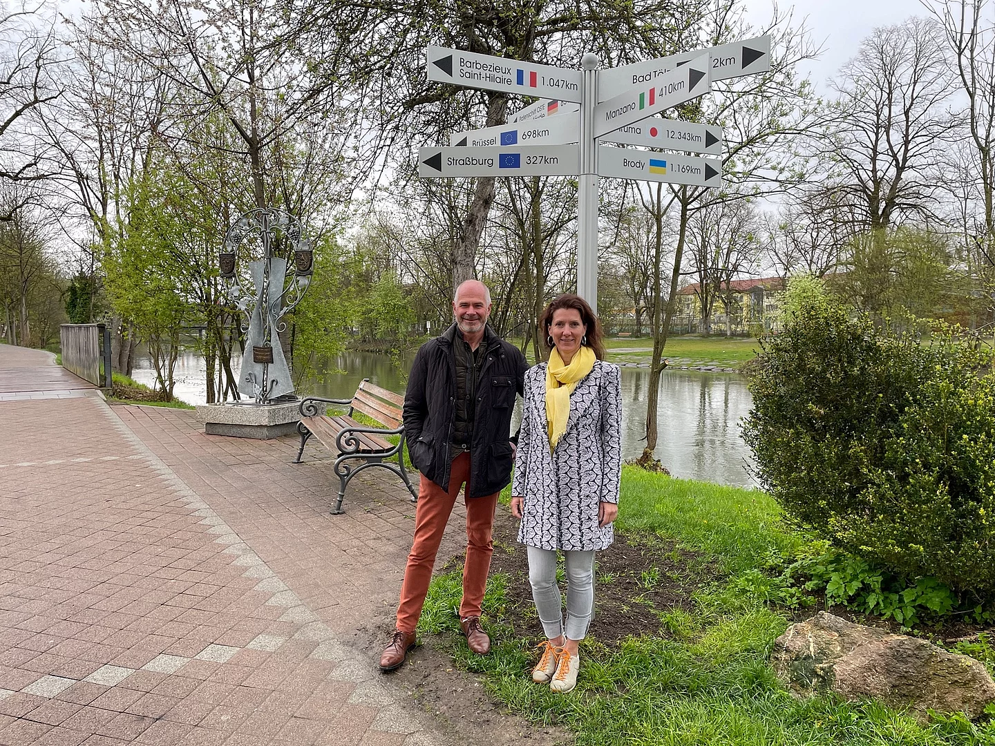 Zwei weitere Schilder ergänzen die Sammlung - sie weisen nach Westen, Richtung Straßburg und Brüssel. „Wir möchten mit diesem Wegweiser zeigen, dass wir Europa in unsere Mitte holen“, sagt Stadträtin Dr. Ulrike Krischke, deren Idee der Wegweiser war. Erster Bürgermeister Heilinglechner sieht den Wegweiser als positives Zeichen: „Ich freue mich über dieses Symbol. Es zeigt, dass wir unsere internationalen Freundschaften im Bewusstsein behalten.“