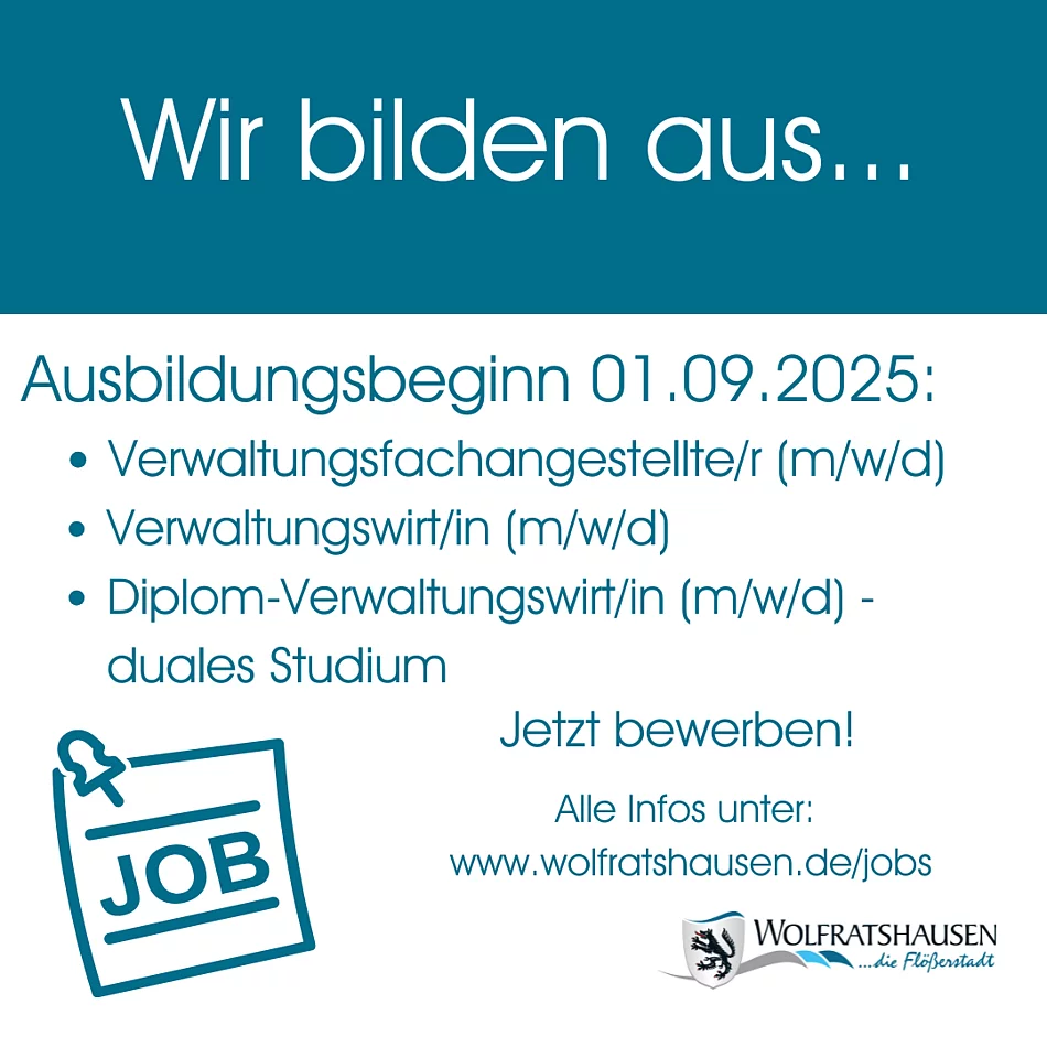 Die Stadtverwaltung bildet aus: Wir bieten zum Ausbildungsbeginn im September 2025 Ausbildungsplätze an zum Verwaltungsfachangestellten, Verwaltungswirt und einen dualen Studienplatz zum Diplom-Verwaltungswirt (m/w/d). Mehr Informationen dazu unter www.wolfratshausen.de/jobs
