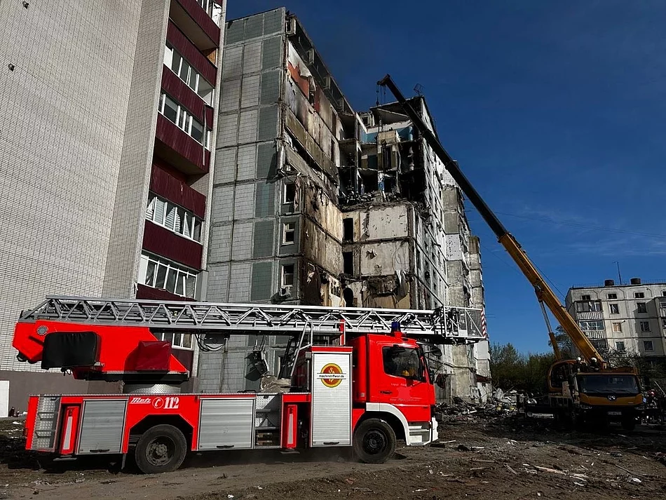 Auf dem Foto ist die Drehleiter nach einem Einsatz vor dem zerbombten Wohnblock in Uman zu sehen.