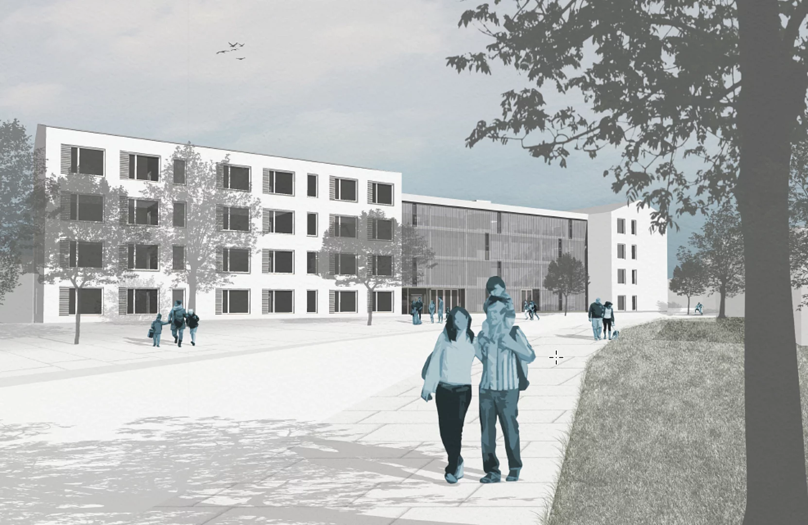 Geplant ist eine Umsetzung in Holzhybridbauweise. Im ersten Bauabschnitt soll ein Gebäude für die Grundschule neu gebaut werden. Im Untergeschoss wird ein Lehrschwimmbecken entstehen. Geplanter Baubeginn ist Frühjahr 2023. Mit der Fertigstellung des ersten Bauabschnittes wird im Jahr 2025/2026 gerechnet.